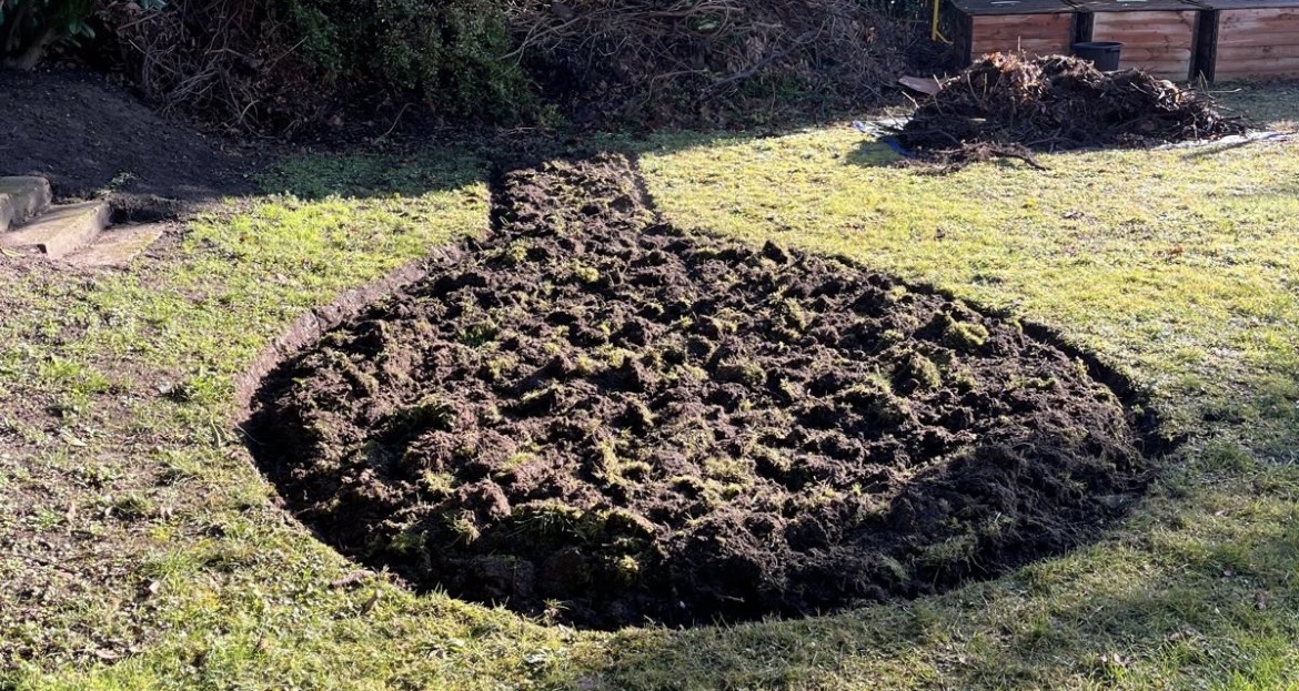 Nous avons décidé d’implanter notre potager, d’une dimension de 7m x 3m, sur une pelouse existante très bien ensoleillée dans la journée et d’essayer de lui inclure la forme d’une raquette de tennis.