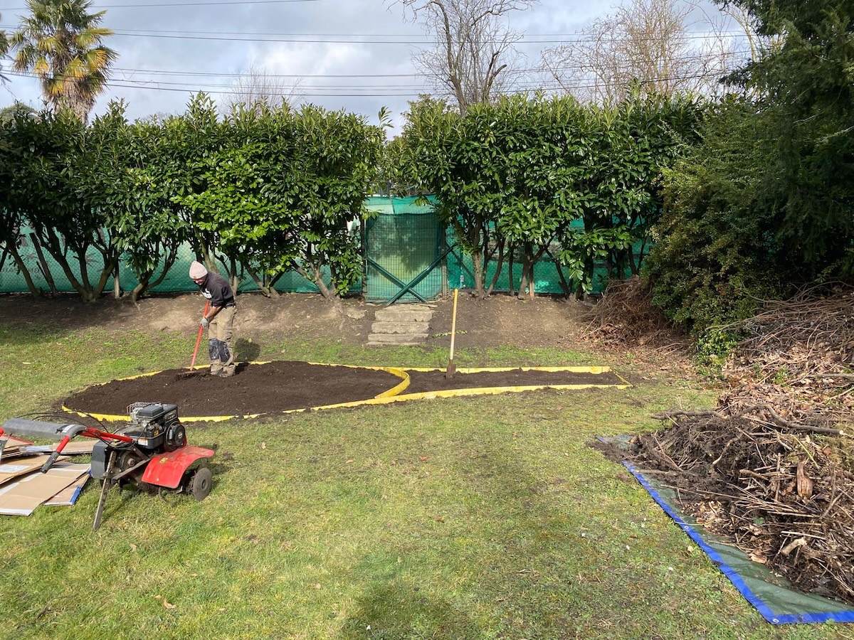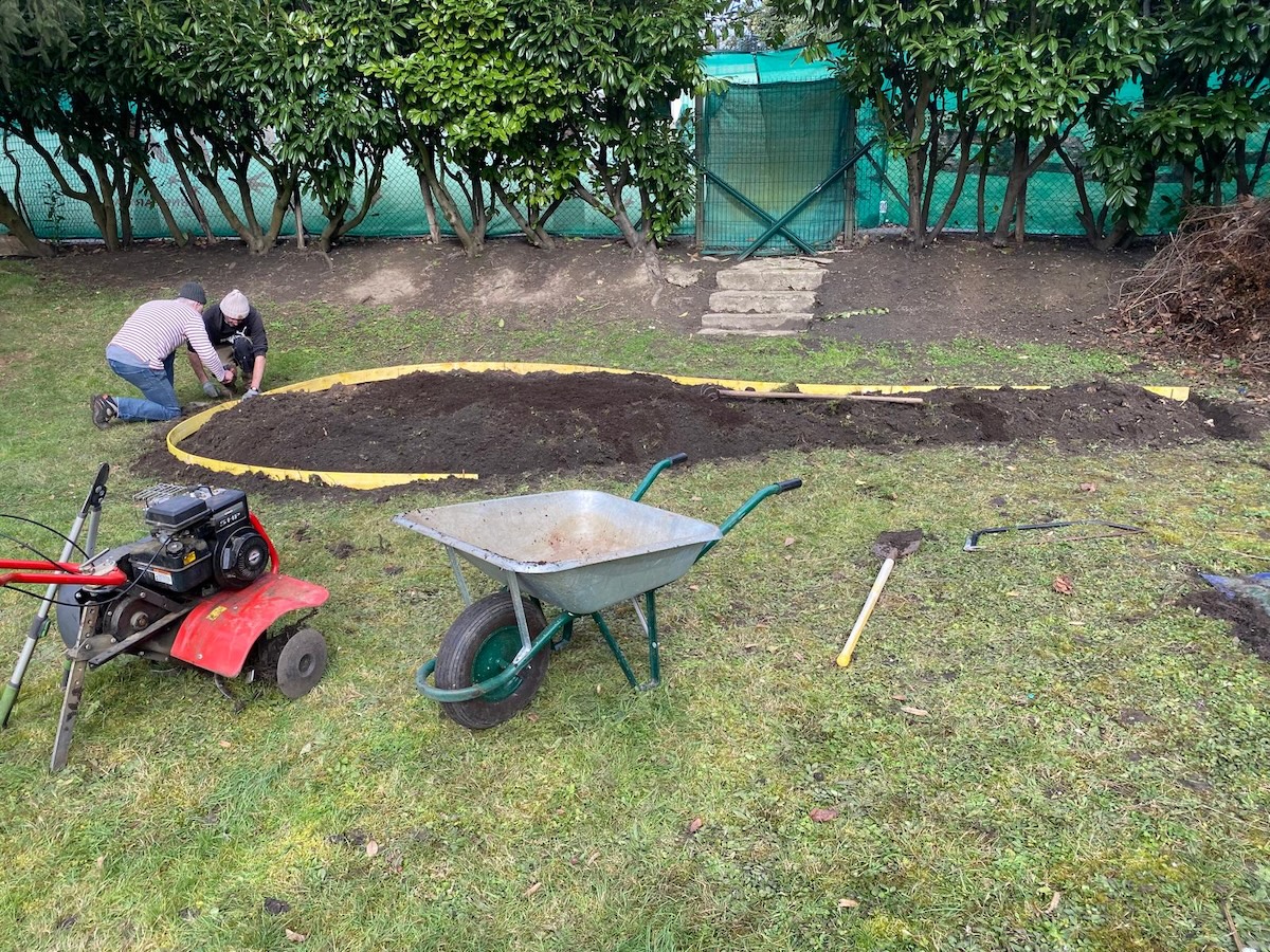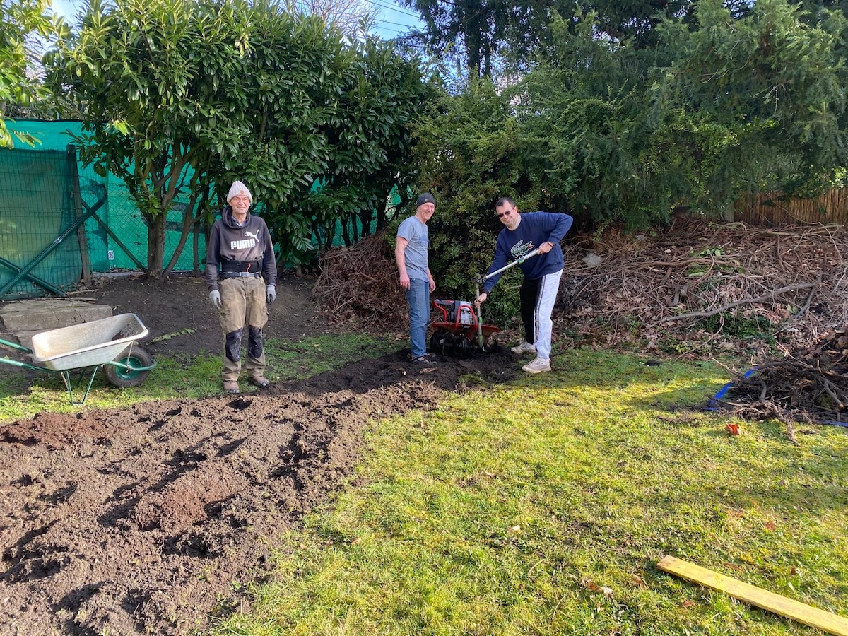 Nos formidables bénévoles, investis avec enthousiasme sur ce projet depuis plusieurs semaines — Armelle, Caroline, Édith, Marie-Anne, Nadine, Nathalie, Éric et Fabrice — se sont retrouvés pour retourner la terre, installer les planches de bois périphériques et donner au potager sa forme définitive… une belle raquette de tennis, à la suite de la préparation effectuée par Paolo !